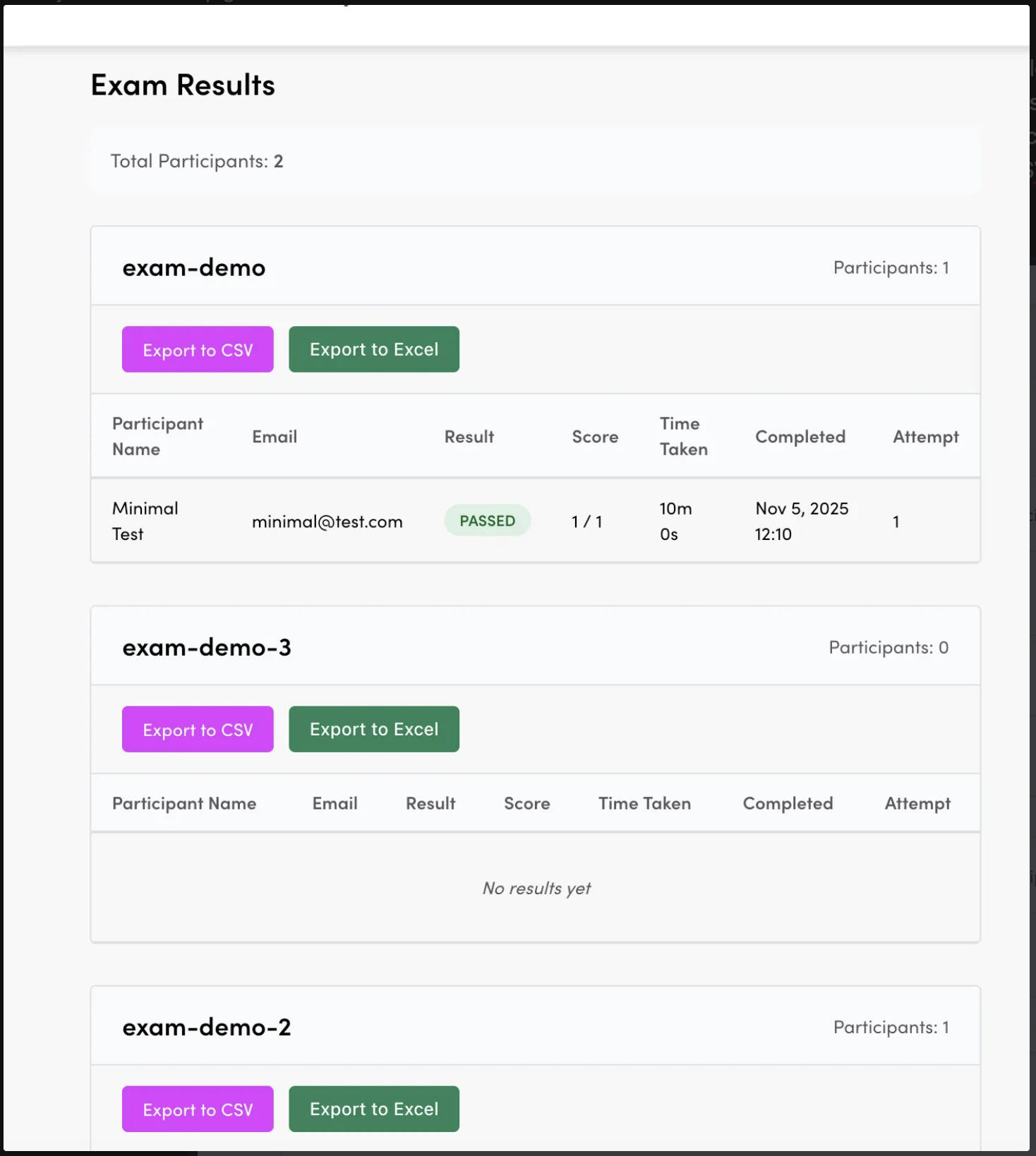 1. When users complete exams, the webhook will now receive data about completions. If email notifications are configured in the videosync admin panel, a specified user can receive emails about exam completions. Exam completion data can also be accessed in the Analytics Dashboard. The dashboard supports exporting exam data to CSV and Excel.